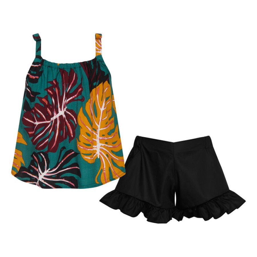 Σετ για κορίτσι με εμπριμέ μπλούζα και μαύρο σορτς με λεπτομέρεια στο τελείωμα