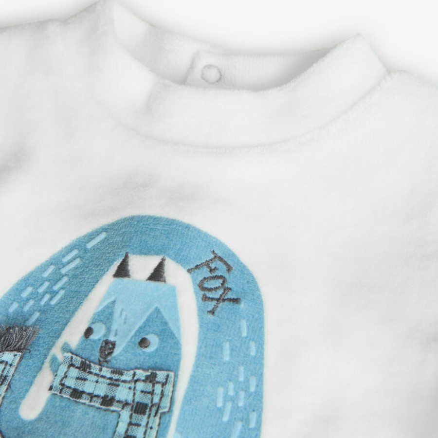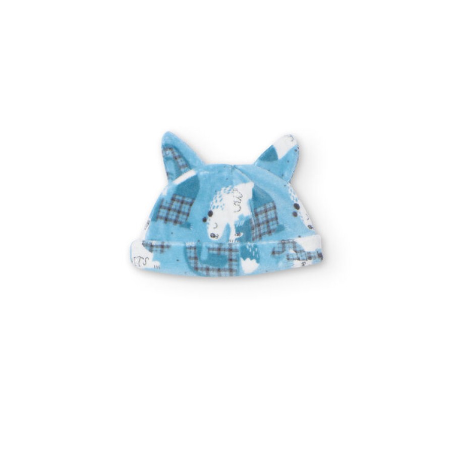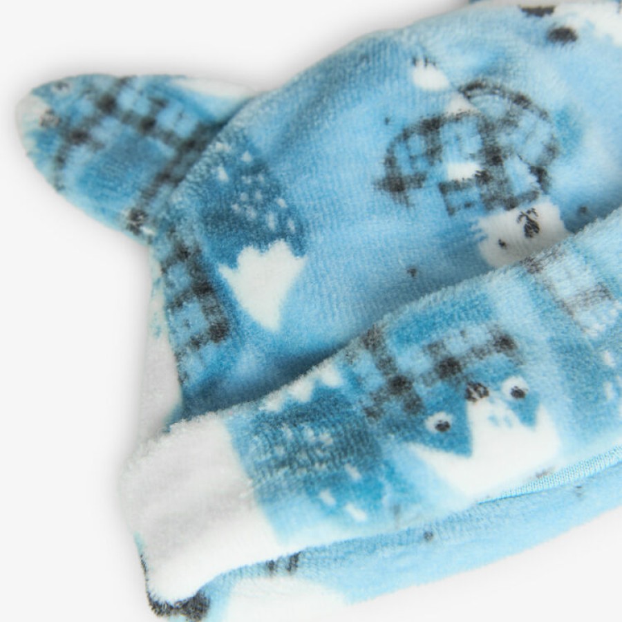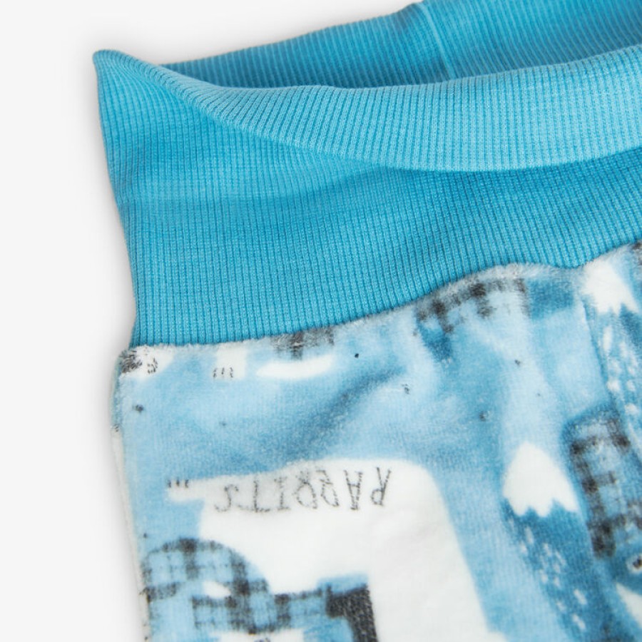 Σετ βρεφικό βελουτέ με μπλουζάκι σε εκρού χρώμα με σχέδιο παντελονάκι σε γαλάζιο χρώμα με σχέδιο και κλειστό ποδαράκι και σκουφάκι μέσα σε υφασμάτινη συσκευασία