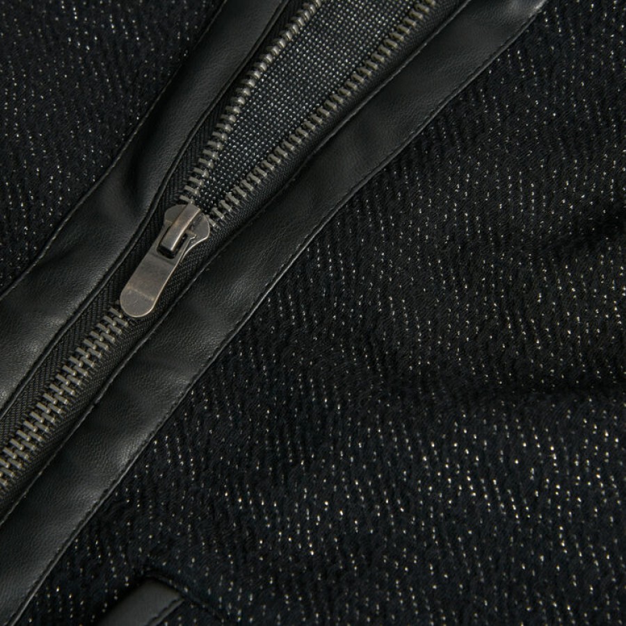 Ζακέτα με φερμουάρ σε χρώμα μαύρο με γυαλιστερή ύφανση και δερμάτινες λεπτομέρειες