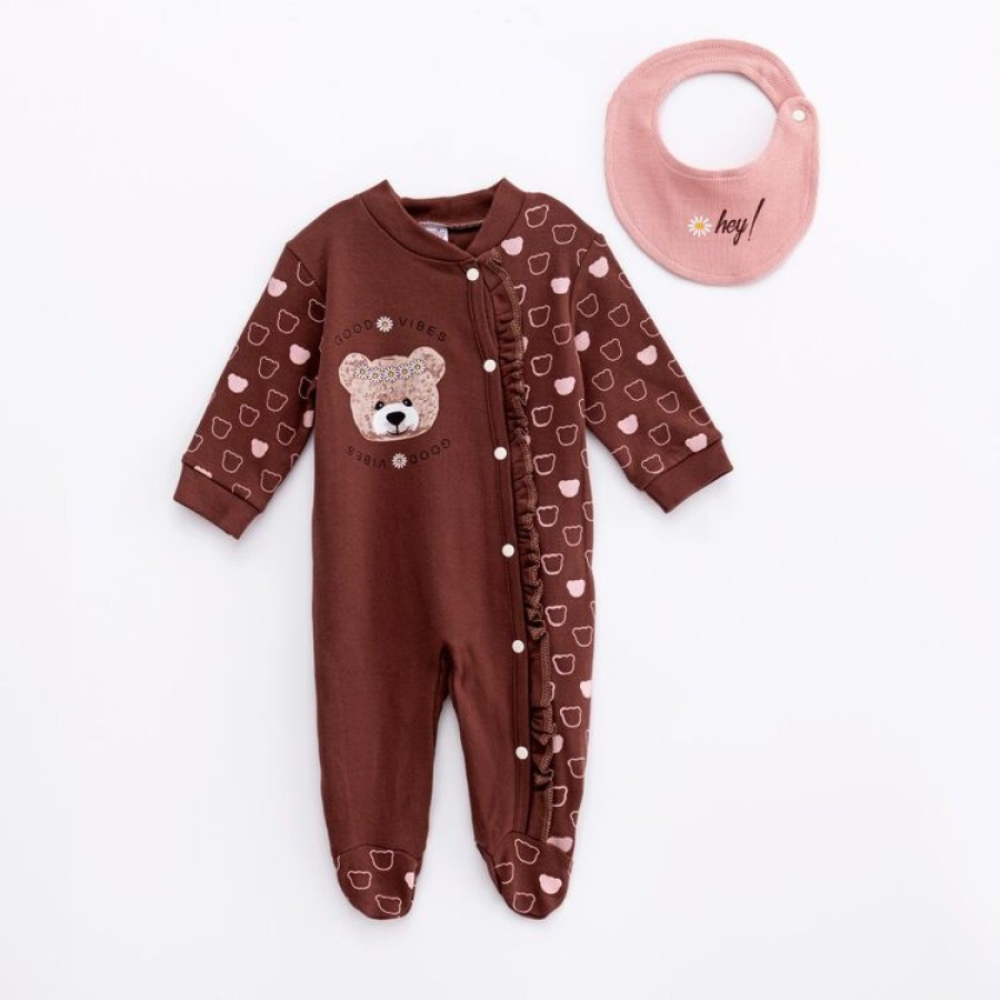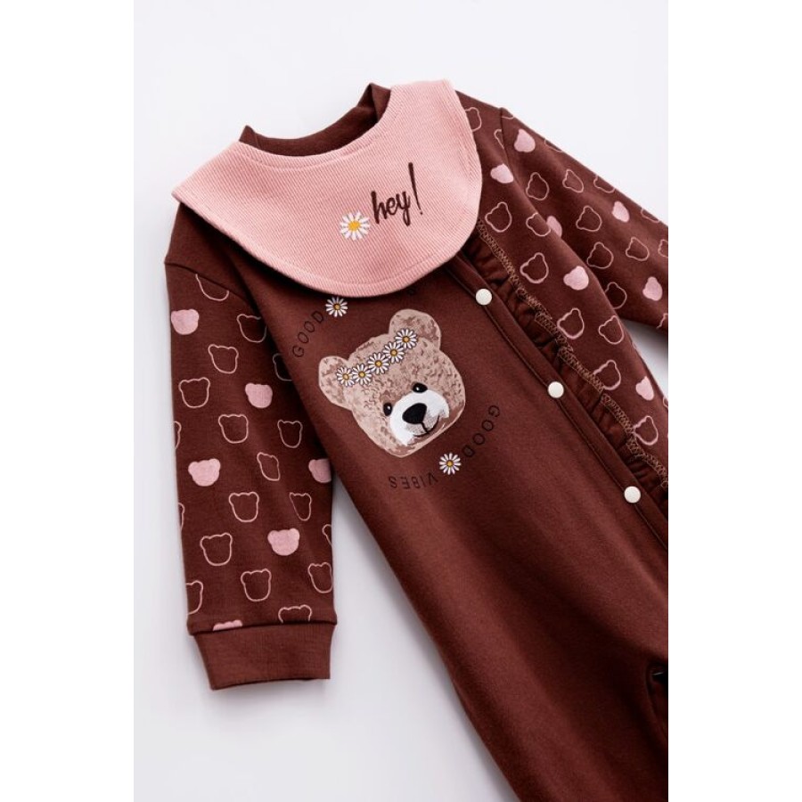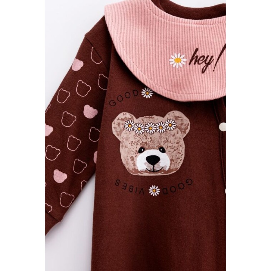 Φορμάκι εποχιακό με σαλιάρα σε χρώμα καφέ ροζ και σχέδιο αρκουδάκι