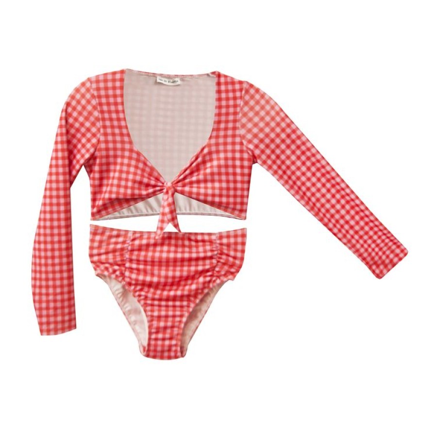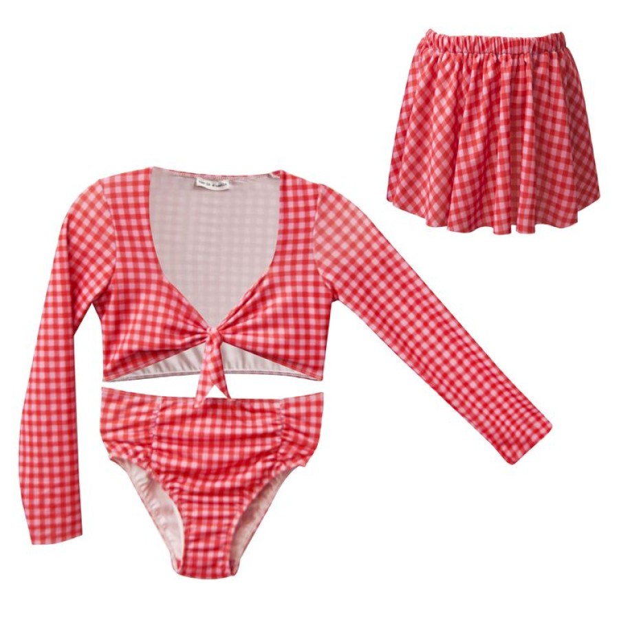 Μαγιό για κορίτσι μπικίνι με μακρύ μανίκι σε καρό κόκκινο ροζ μαζί με φούστα
