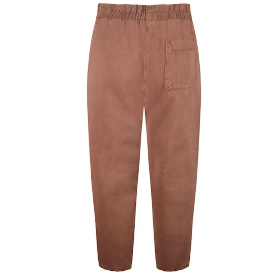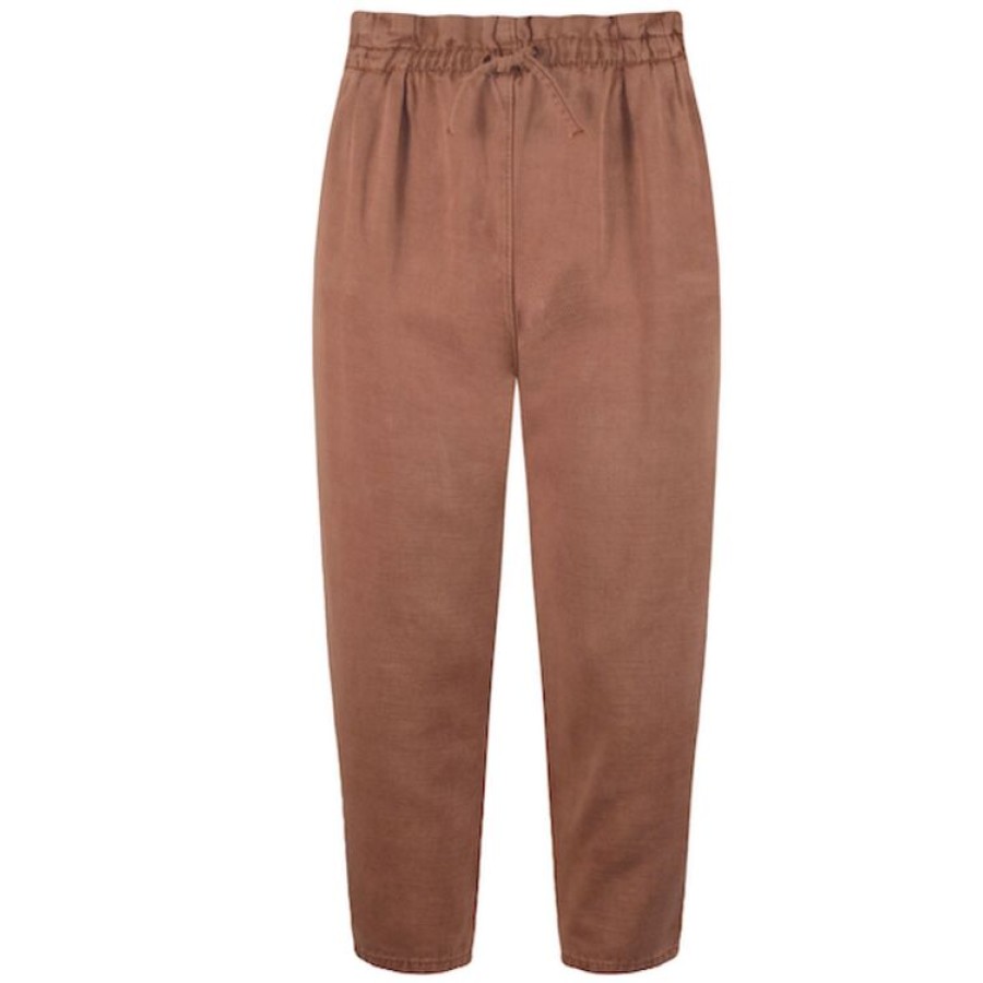 Μονόχρωμο παντελόνι με λάστιχο και βολάν στη μέση.