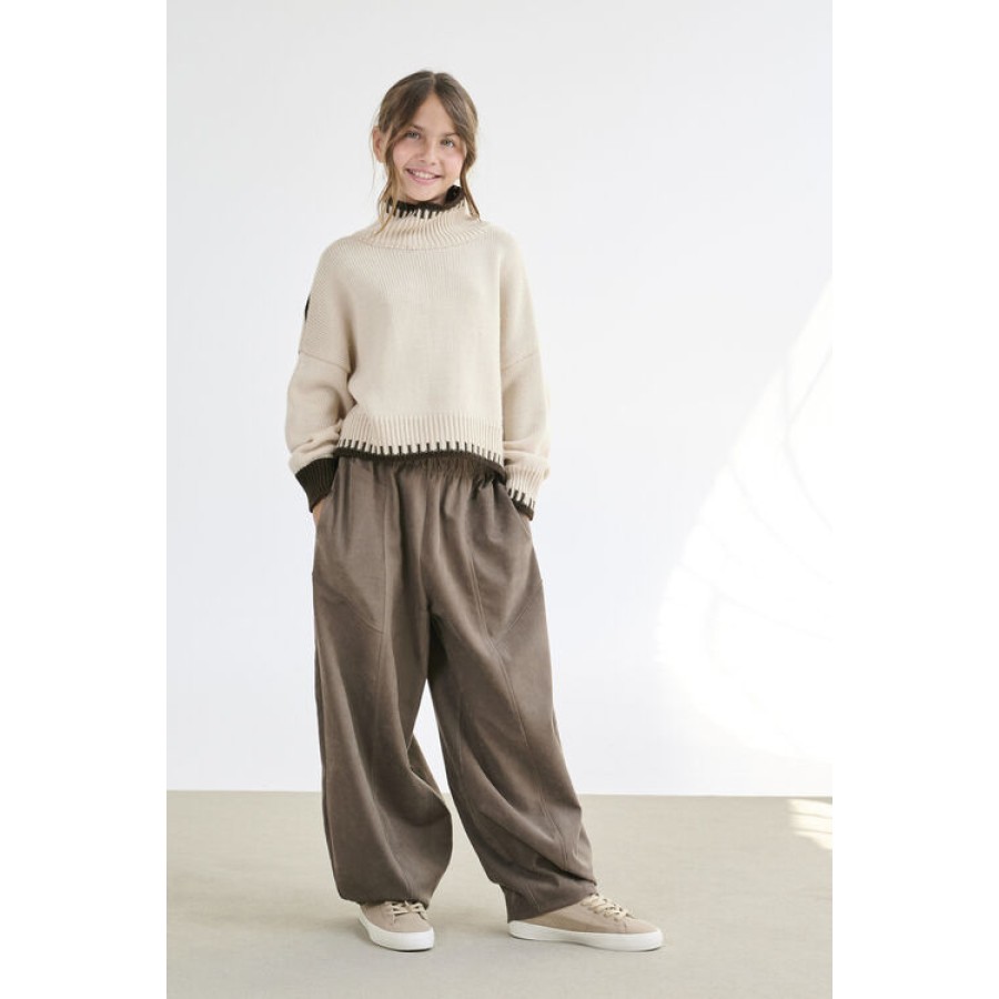 Άνετη παντελόνα σε χρώμα πούρο φαρδιά στους γοφούς, ελαφρώς στενεύει προς τον αστράγαλο.