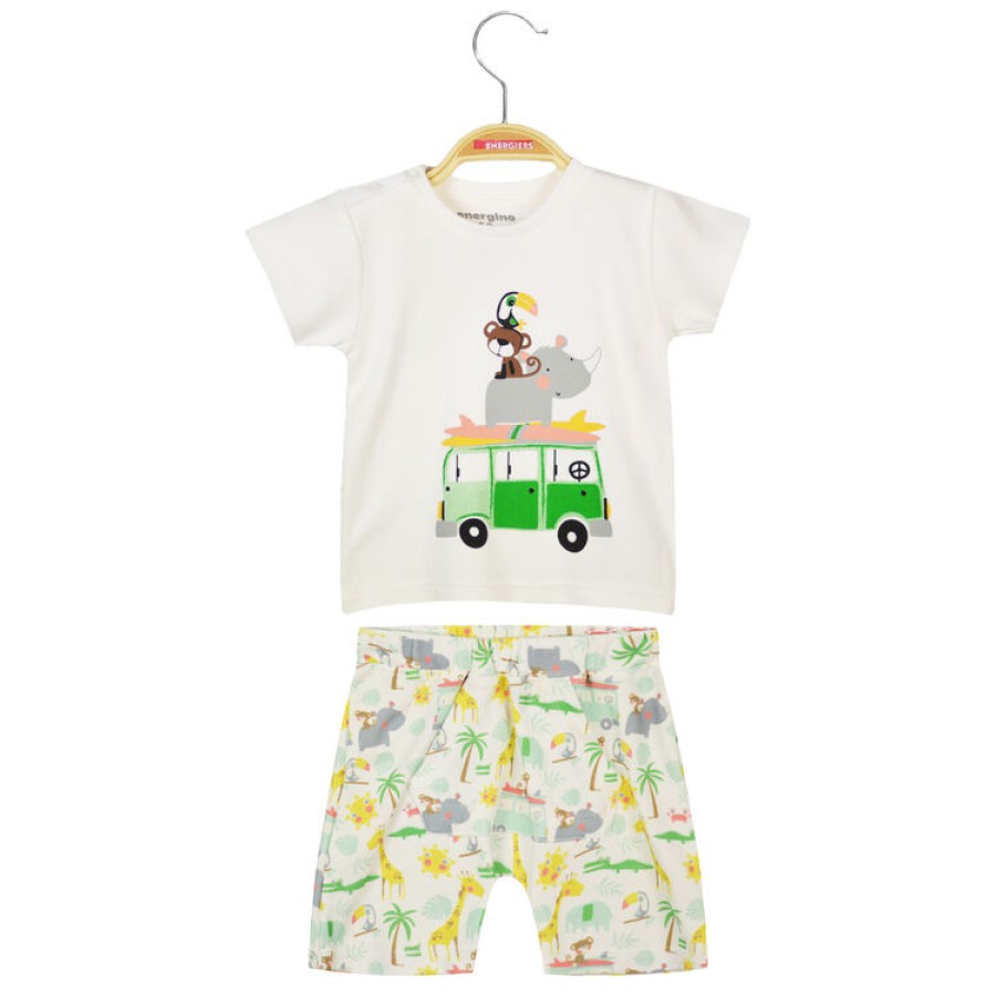 Μακό βαμβακερό σετ με μπλούζα τύπωμα φορτηγάκι και μακό σορτς εμπριμέ τύπωμα ζώα ζούγκλας και καγκουρό τσέπη